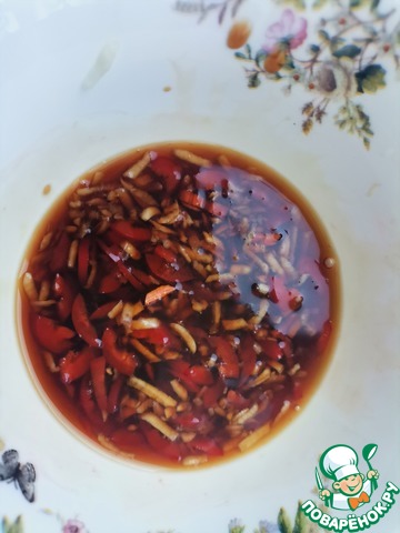 В пиалке смешать мелко рубленный перец Чили, пропущенный через пресс чеснок, соевый соус и уксус.