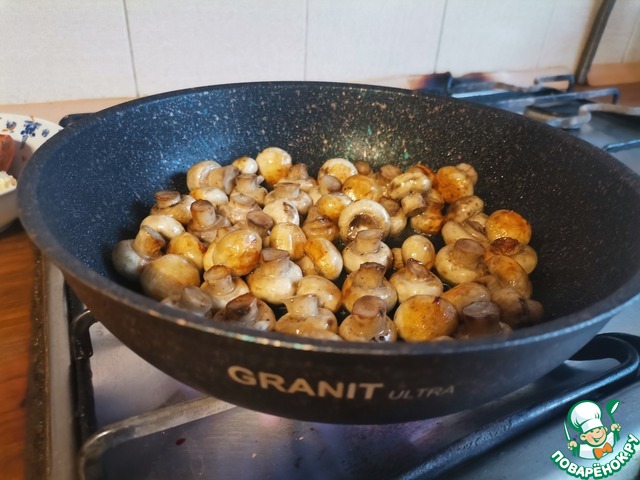В глубокой сковороде разогреть растительное масло. Я использую свою помощницу, сковороду ТМ Kukmara, серии GRANIT Ultra. Обжарить шампиньоны до золотистого колера, часто помешивая. На это уйдёт не более 3 минут.