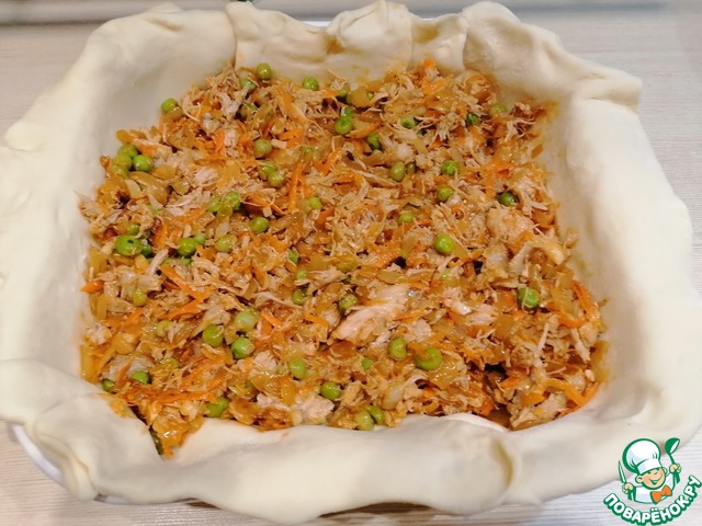 Мясо можно взять любое, даже фарш. В сковороде обжарить вместе мясом (резанное или фарш), нарезанные лук и морковь минут 10-15. Добавить зеленый горошек, можно добавить кукурузу, если кто любит, соевый соус, кетчуп, резанный чеснок, кориандр, соль, перец, муку.