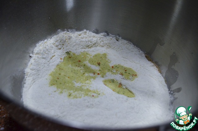 Смешать йогурт и тёплую воду, просеять оба вида муки, добавить сахар и дрожжи. Вместо соли я использую сухой грибной бульон "Домашний" от ТМ Роллтон, уже пекла из подобного теста, результат понравился. Всё соединить в одну массу.
