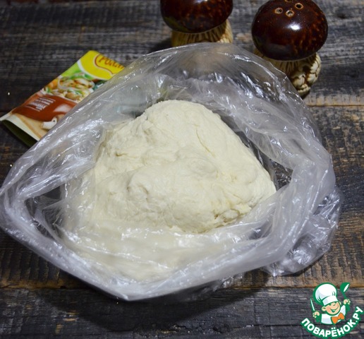 Влить растительное масло и вымесить гладкое тесто. Поместить в пакет, завязать и оставить на столе для выбраживания, 1-1,5 часа.