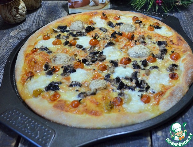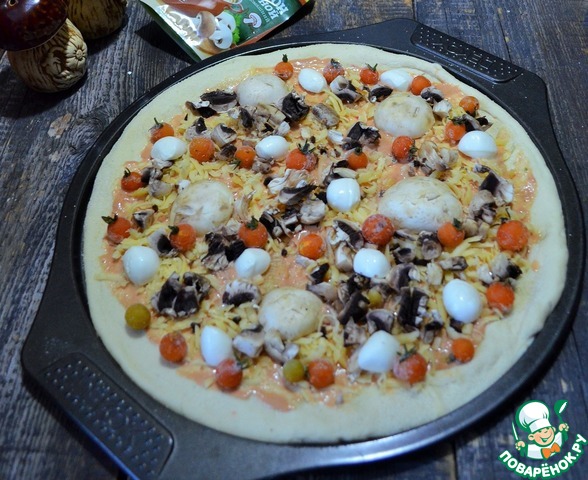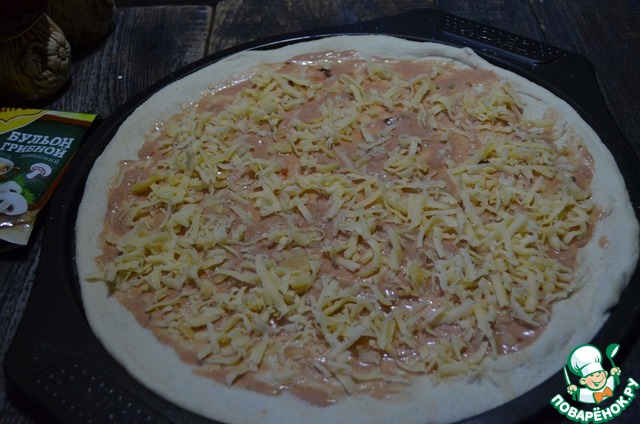 Смешать томатный соус, сметану и грибной бульон "Домашний". Смазать этим соусом основу. Посыпать натёртым сыром. -