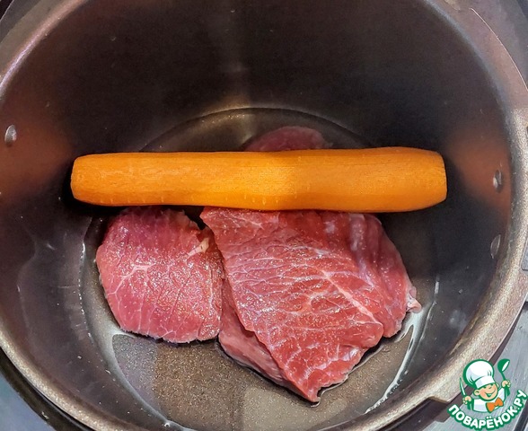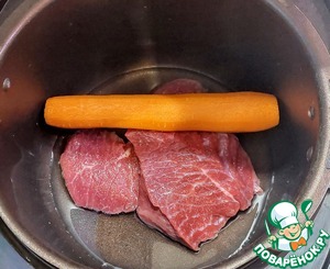 Мякоть говядины промыть, обтереть солью, поместить в чашу мультиварки. Морковь помыть, почистить, отправить к мясу. Налить воды 50 мл. закрыть крышку мультиварку, поставить на режим "тушение" на 1.5 часа.