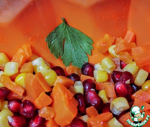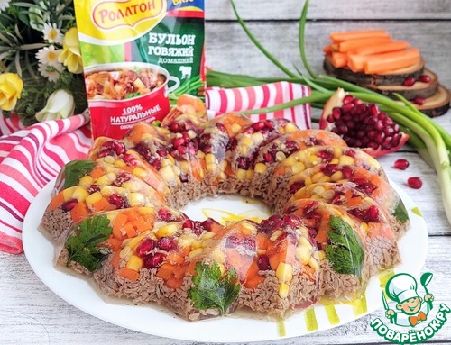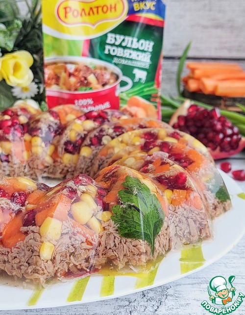 Вкус заливного из говядины неимоверно интересный — нежное и ароматное мясное желе, с небольшой кислинкой, который придает гранат, плюс сладкая кукуруза и морковь — это очень вкусное сочетание, которое многим придется по вкусу. Угощайтесь!