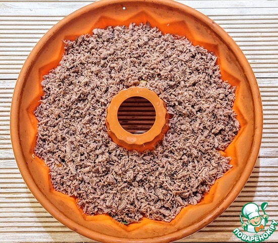 Говядину произвольно нарезать или измельчить в блендере. Распределить поверх моркови.