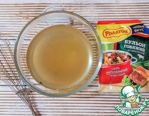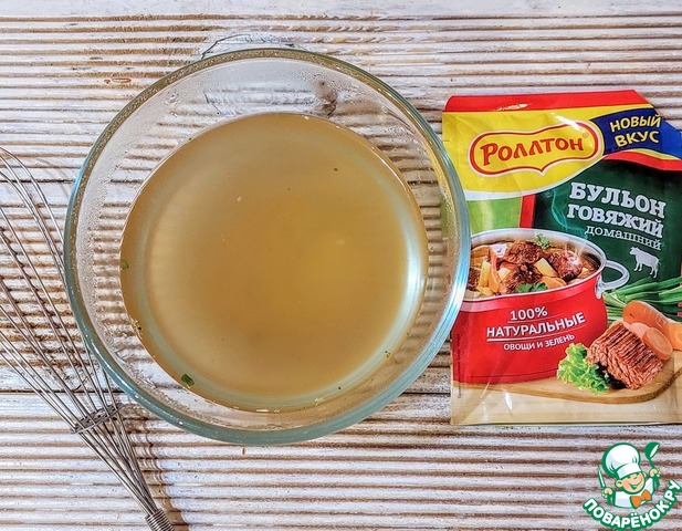 В 600 мл. кипятка развести 1.5 ч. л. говяжьего бульона "Роллтон ", тщательно перемешать. Затем всыпать желатин и размешать до полного его растворения.