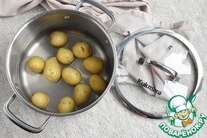В кипящей воде сварите мелкий картофель в мундире. Слейте и обдайте холодной водой.