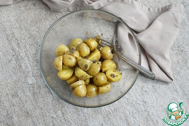Нарежьте картофель половинками и горячий выложите в миску с заправкой. Перемешайте и дайте постоять минут 10.