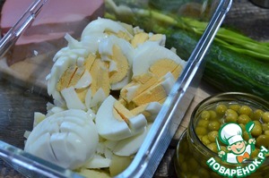 Приготовить продукты. Картофель и яйца сварить и остудить. Овощи и зелень вымыть и обсушить.