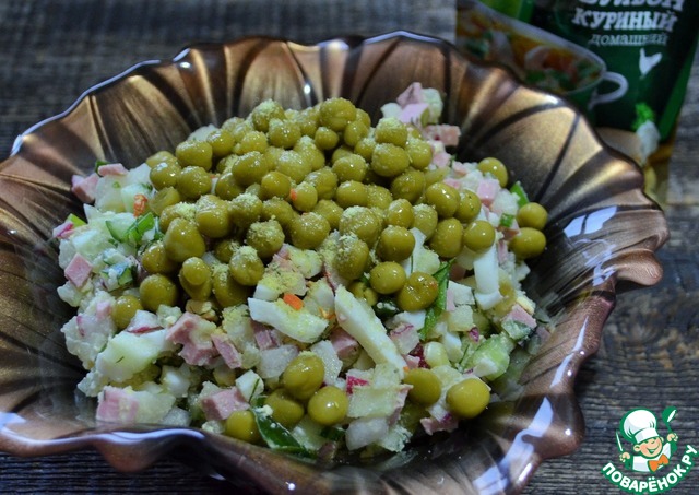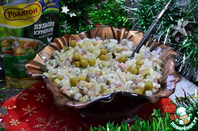 Переложить в салатник для подачи, заправить майонезом, добавить зелёный горошек и сухой куриный бульон ( вместо соли), ещё раз перемешать.