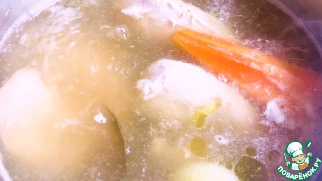 Первым делом в миску кладем курицу, заливаем ее водой, добавляем овощи, соль, лавровый лист, бульонные кубики.