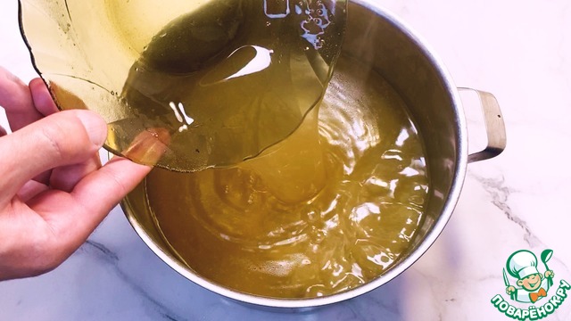Затем в еще горячий бульон отправляем набухший желатин и хорошенько все перемешиваем.
