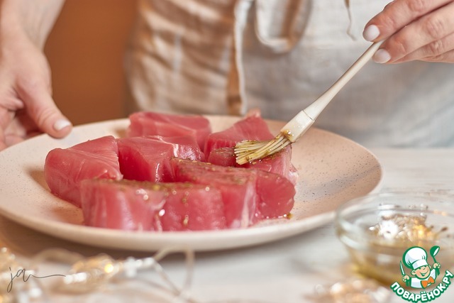 Кисточкой с двух сторон обмазать кусочки рыбы. Мариновать всего лишь 15 минут.