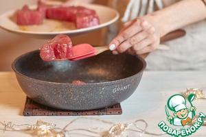 На хорошо разогретую сковороду выложить куски рыбы. Жарить от двух до пяти минут на каждой стороны. Время зависит от размера кусков и желаемой степени прожарки. Я жарила по три минуты.