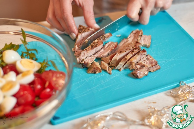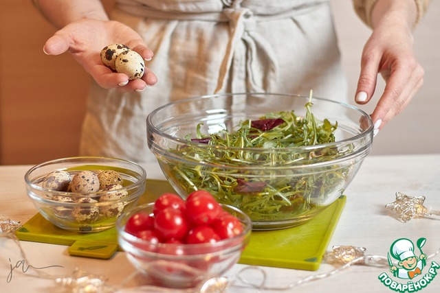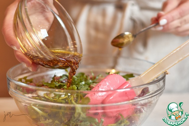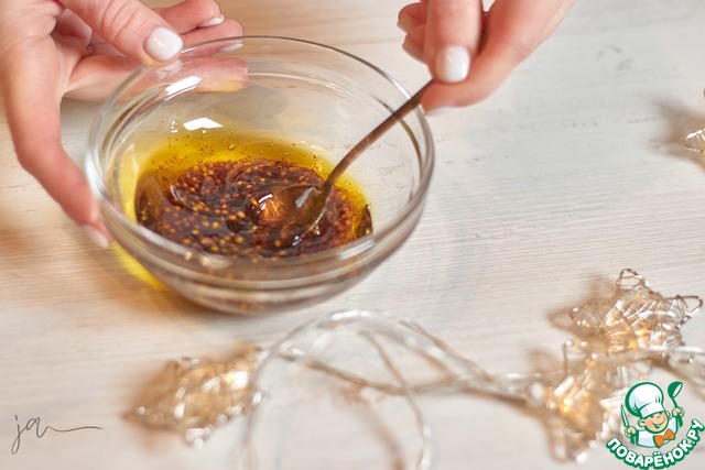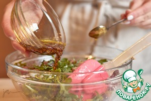 Для заправки смешайте оливковое масло, соевый соус, дижонскую горчицу и наршараб.