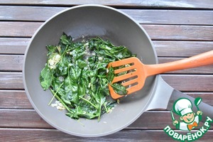 В сковороде разогреваю сливочное масло. Пассерую, нарезанный кубиком лук. Довожу его до мягкости прозрачности. Добавляю шпинат, перемешиваю и снимаю сковороду с огня.