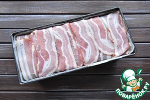Прямоугольную форму для запекания выстилаю силиконоизированной пергаментной бумагой и укладываю полоски бекона. Бекон должен покрыть дно, бока формы и свободные концы оставляю чтобы укрыть верх террина.