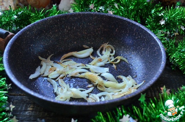 Перья лука обжарить на растительном масле, 3 минуты, огонь ниже среднего.
