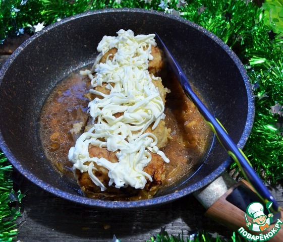 Влить немного воды, положить сыр на шницели, накрыть крышкой, томить на минимальном огне, 10 минут.