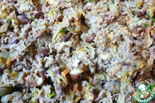 Подготовить нужные ингредиенты для начинки. Фасоль желательно замочить на ночь в воде, а затем сварить до готовности. Можно взять консервированную фасоль, но с домашней, конечно же, вкуснее. -