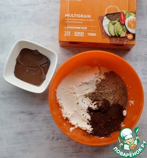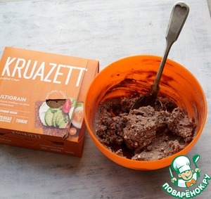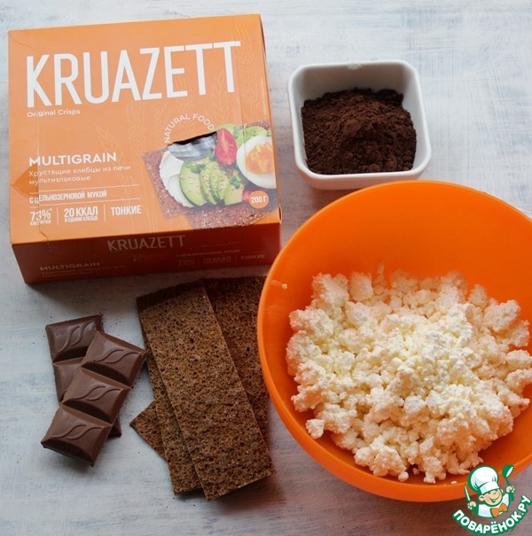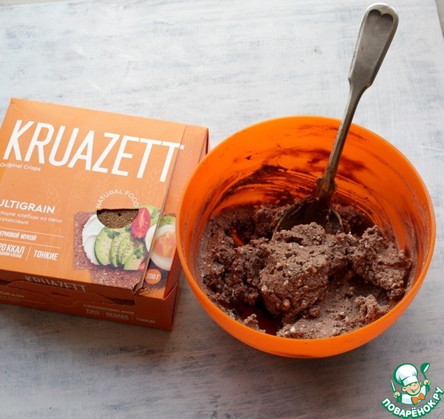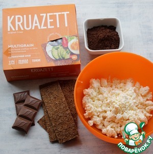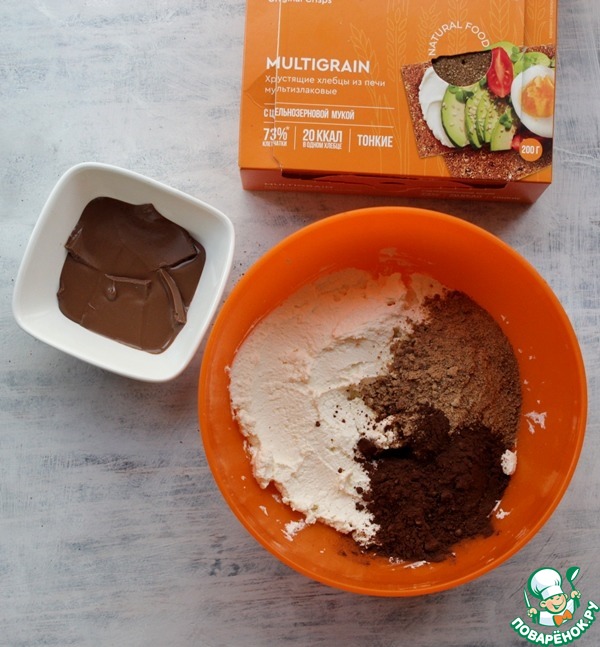 • В чашке соедините творог, хлебцы, 1 столовую ложку без верха какао. Шоколад растопите в микроволновке и добавьте к творожной массе.