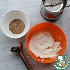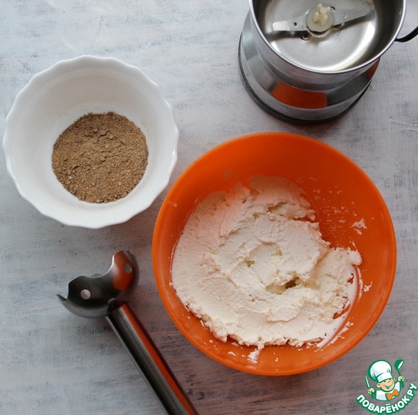 • Творог пробейте блендером, хлебцы измельчите в кофемолке в мелкую крошку.