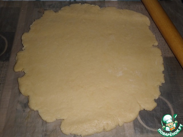 Тесто вынимаем из холодильника. Раскатываем тесто в виде лепешки, слегка припылив рабочую поверхность мукой.