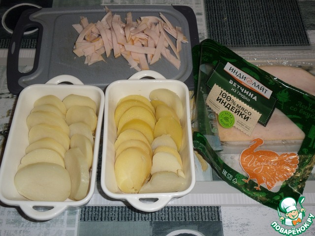 В формы для запекания выкладываем нарезанный картофель. Я готовила порционно, можно приготовить это блюдо в одной большой форме для запекания.