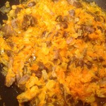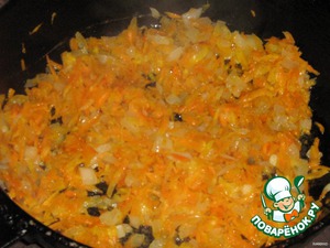 Морковь натереть, лук мелко порезать. Обжарить на растительном масле до полуготовности.