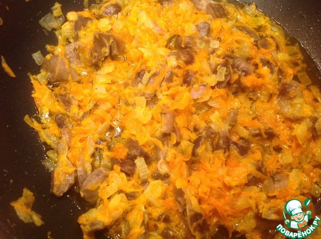 Выложить к овощам желудки. Минут 5 потушить все вместе.