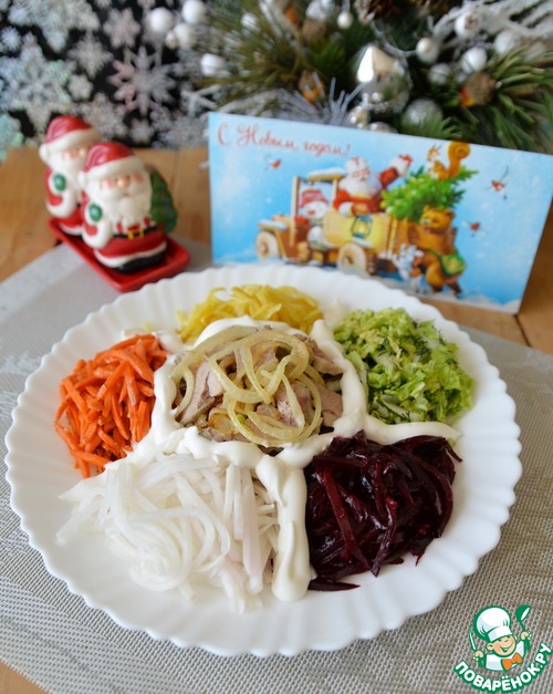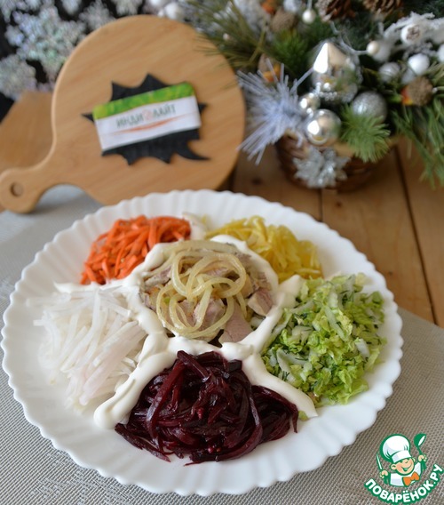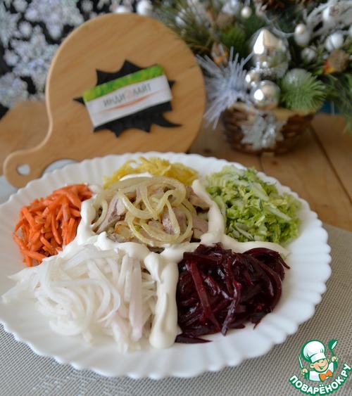 Собираем салат. Берём большое блюдо. Порезанное филе индейки смешиваем с жареным луком, кладём посередине. Вокруг индейки кладём "кучки" из моркови, картофеля, пекинской кпусты, свеклы и редьки.