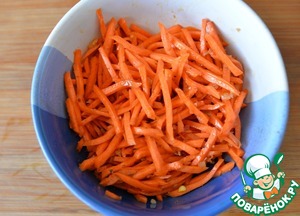 Картофель чистим, обсушиваем, трём на тёрке для моркови по-корейски или тонко режем. Обжариваем на масле до золотистости на среднем огне около 10 минут. Убираем со сковороды.