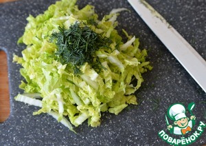 Пекинскую капусту тонко режем, солим, слегка приминаем, добавляем рубленый укроп.