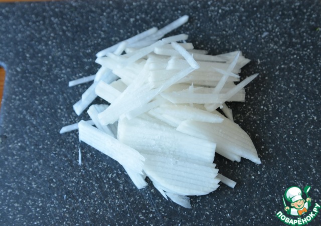 Тонко режем редьку или трём на тёрке для моркови по-корейски. Солим. Не пересолите, так как все продукты для салата солёные. Далее редьку отжимаем.