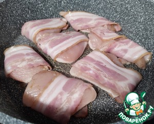 Каждый кусочек индейки завернем в бекон и обжарим с двух сторон на сухой сковороде на сильном огне по 1- 2 минуты с каждой стороны