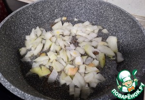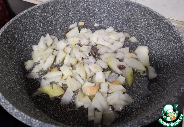Затем на этой же сковороде добавив немного масла обжарим лук минуты 2- 3, постоянно перемешивая