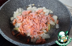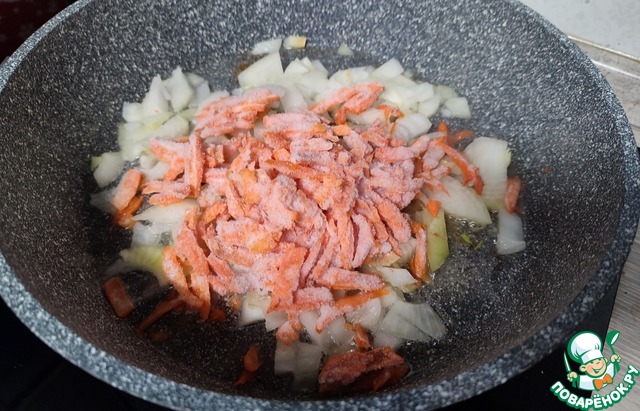 Добавляем к луку натертую морковь. У меня из заморозки. Жарим до мягкости овощей