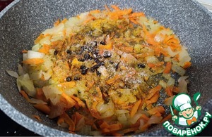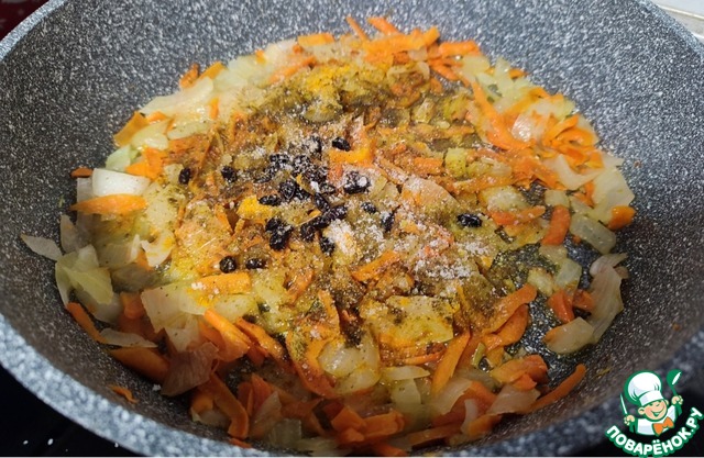 Хорошо промываем рис до прозрачной воды. Добавляем рис к пережарке со специями. Хорошо перемешиваем и жарим 2 минуты
