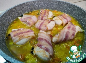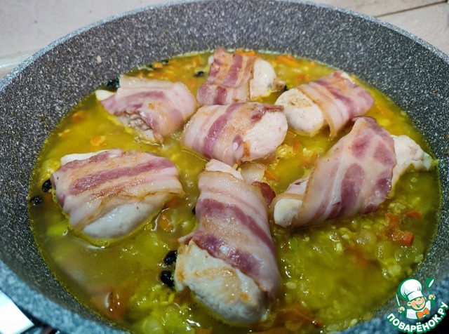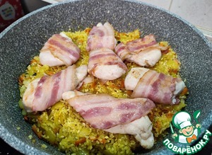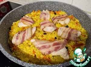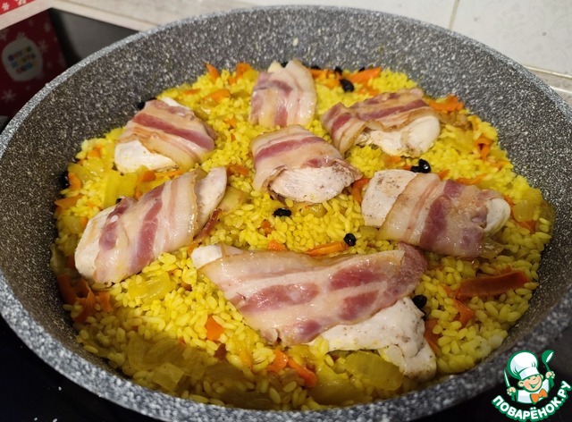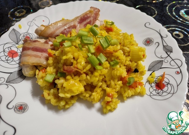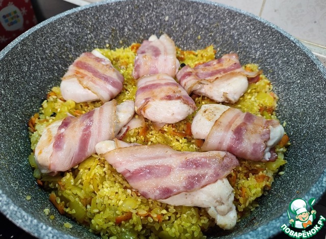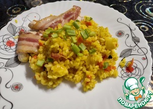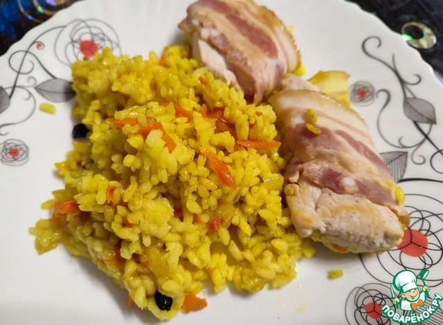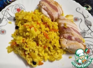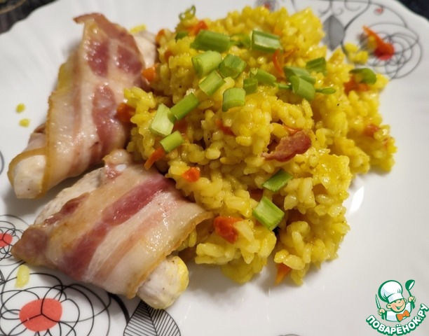 Нежный, ароматный и очень вкусный рис с не менее нежным и сочным филе индейки Индилайт в беконе.