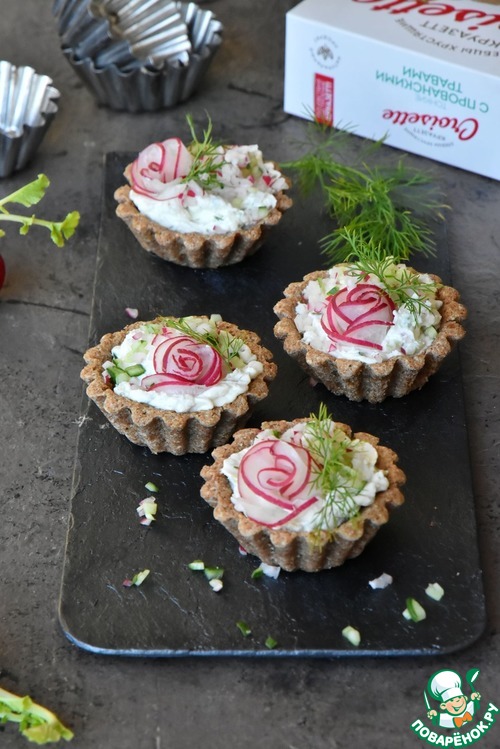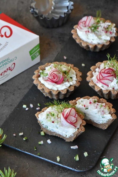 Тарталетки – популярные закуски к любому столу, они актуальны и как новогодняя закуска. Корзиночки с начинкой интересно выглядят, и их удобно есть. В большинстве случаев, их готовят из слоеного (378 ккал)или песочного теста (403 ккал), содержащих большое количество жира. Предлагаю более легкий вариант тарталеток из хлебцев Круазетт (275 ккал). А наполнить их можно любой начинкой сладкой, острой, грибными и сырными пастами, рыбой, мясным паштетом. Свои тарталетки наполню творожной свежей, ароматной начинкой с чесночком. редисом и огурцом.