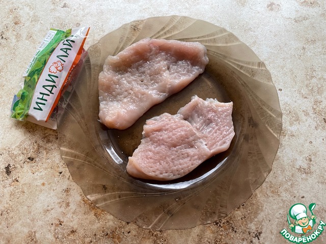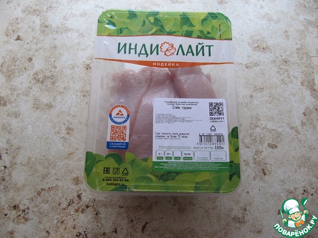 Для приготовления рулетов использую филе грудки индейки ТМ "Индилайт" (стейк), который нарезается из большого филе индейки.