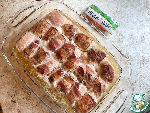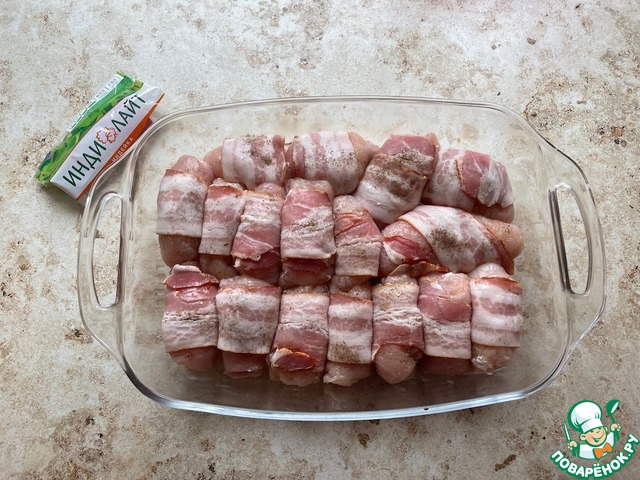 Сворачиваю каждый рулетом, сверху выкладываю половинку полоски бекона (любого копчения), выкладываю в сухую форму для запекания.