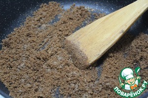 На сковороде растопить сливочное масло и обжарить крошки хлебцев со специями.