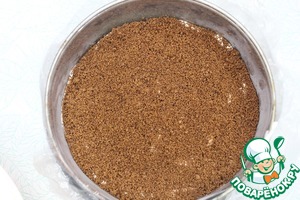 Форму (у меня на 16) застелить пищевой пленкой и выложить на дно очень тонкий слой крошек.