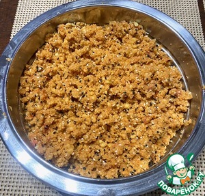 К измельченному крамблу добавляем кунжут (у меня белый и черный), копчённую паприку, итальянские травы, перец и вяленые томаты кусочками, перемешиваем. Добавляем мягкое сливочное и кокосовое масло, молоко, все перемешиваем.