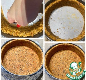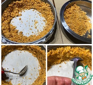 Начинаем формировать основу чизкейка в форме, прижимая крошки песочного теста для начала к стенкам, а затем ко дну. Выравниваем согнутой столовой