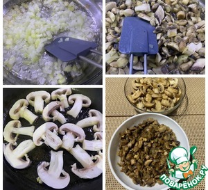 Лук очистить и мелко нарезать, обжарить на оливковом масле. Затем добавить грибы и, помешивая, обжарить на сильном огне до испарения жидкости. Добавляем соль и перец по вкусу, перемешиваем, даем остыть.