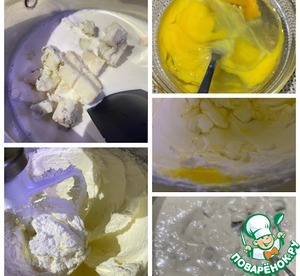 В миксере, на небольшой скорости вымешиваем сливочный сыр до кремового состояния, после чего в несколько приемов влить яичную смесь, тщательно объединить до однородности.