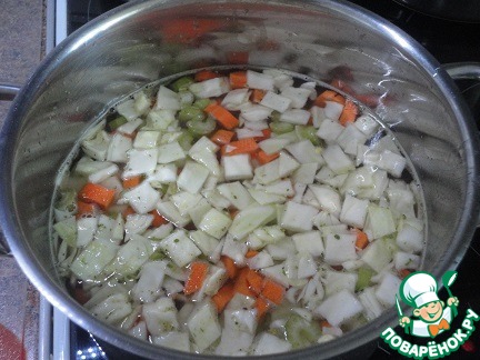 Морковь, капусту, картофель и сельдерей залить 1,5 л воды или бульона, довести до кипения и варить 15 минут.
