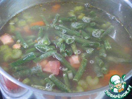 К овощам добавить помидор и фасоль, довести до кипения и варить еще 5 минут. Попробовать на соль, добавить сухие травы.